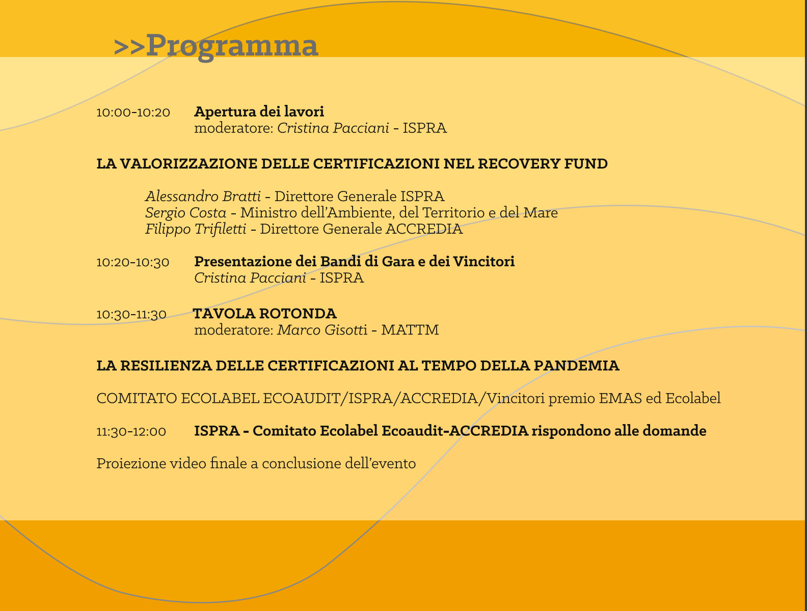 Il programma prevede gli interventi sulla valorizzazione delle certificazioni nel recovery fund, da parte di Alessandro Bratti, direttore generale ISPRA; il Ministro per l’Ambiente generale Sergio Costa ; Filippo Trifiletti, direttore generale Accredia.