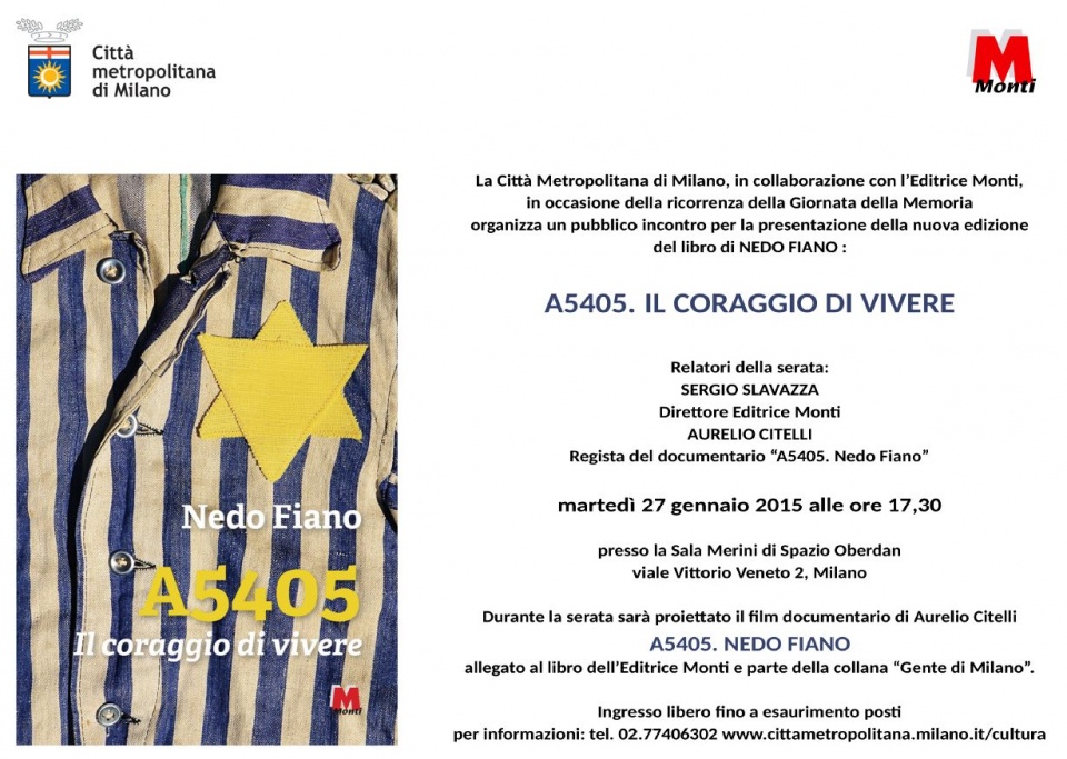 Giornata della Memoria: martedì 27 gennaio, ore 17.30 presentazione del libro: “A5405. Il coraggio di vivere” di Nedo Fiano e proiezione del documentario “A5405. Nedo Fiano”.