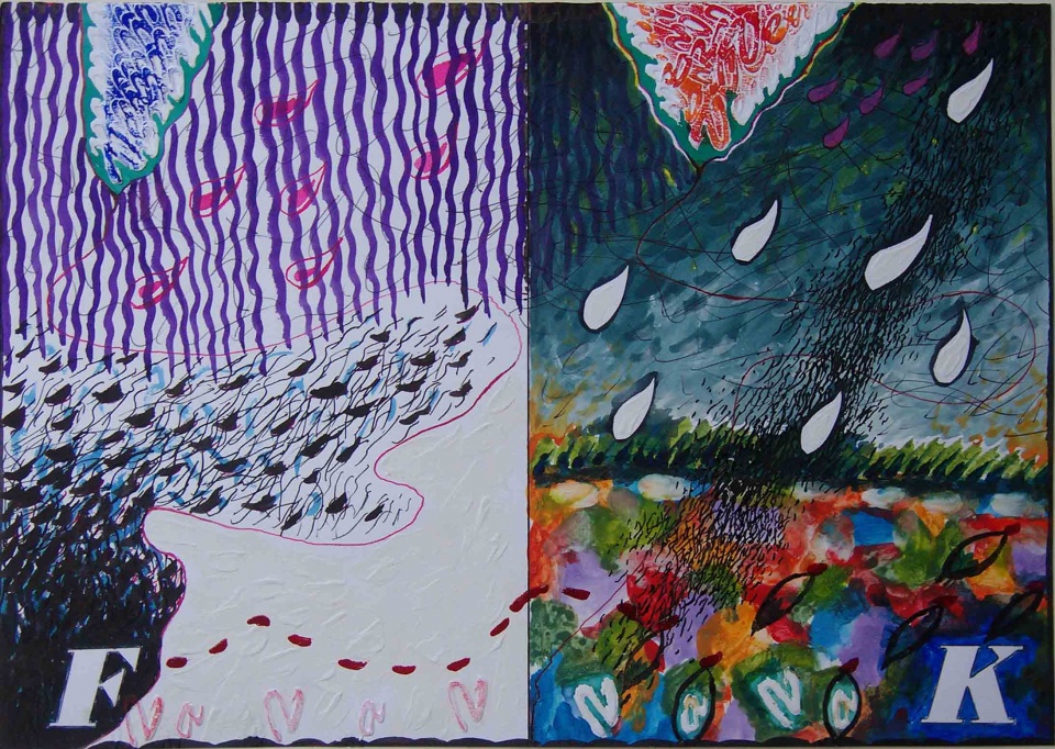 Nella tavola (divisa in due), vi si nota la grande F di Frida e la grande K di Kahlo, lettere contestuali tra la grande fioritura-vita fatta di macchie colorate con una sintesi di segni armoniosi in movimento come petali al vento, e in basso, la V come volo e agitazioni ventose, la A come significante di armonia. L’opera colpisce, in quanto nell’apparente diversità psichico-artistica dall’autrice messicana, ha invece una forte comunicazione di quegli intenti antitetici ma poetici che la Kahlo esprimeva in completa libertà. Qui, il segno gestuale, dinamico fluttua tra l’immagine significante non solo a livello simbolico, in quanto i contenuti reali si avallano tra realtà e suggestione senza automatismi. Privi di retorica, senza tuttavia rinunciare al segno quale livello enimmico di una serie di fotogrammi in sequenza carichi di intrinseci valori umani.