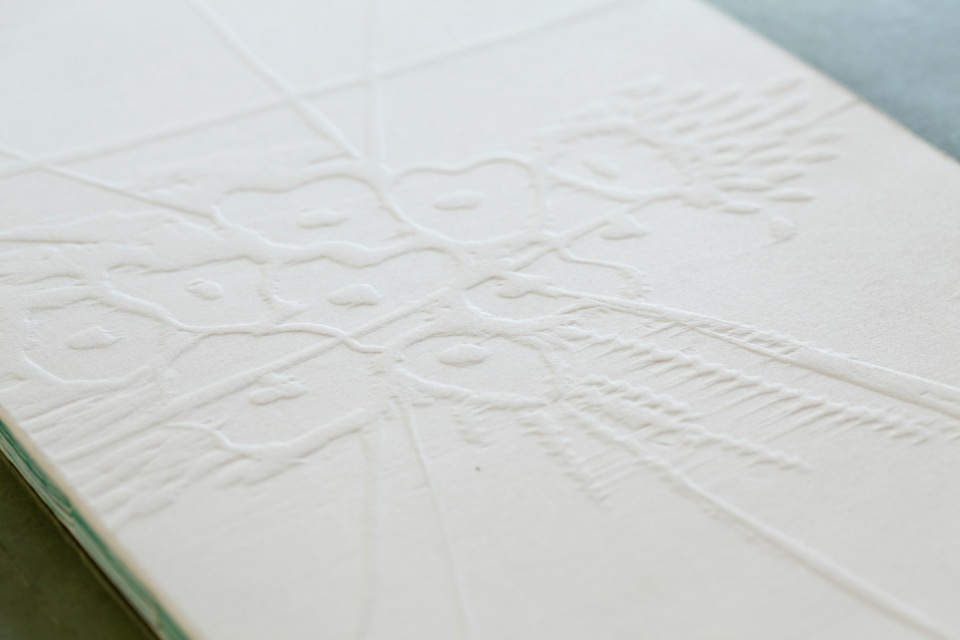 Alessandra Angelini_Il Giardino è aperto_libro d'artista_2015 © Andrea Artoni (5)Le xilografie a secco, pensate come memoria della matericità della natura, accompagnano tutte le pagine del libro, dando ritmo alle immagini e agli scritti. Il colore, bianco e verde delle pagine e dei testi, si illumina di passaggi talvolta lievemente iridescenti, che Alessandra Angelini percepisce come “in sospensione tra l’immaginario e il reale, come simbolo delle trasformazioni che avvengono in natura, dalla nascita di un germoglio alla sua fine; un percorso che non si limita alla vita del fiore o della pianta ma allude al viaggio dell’uomo sulla terra”.