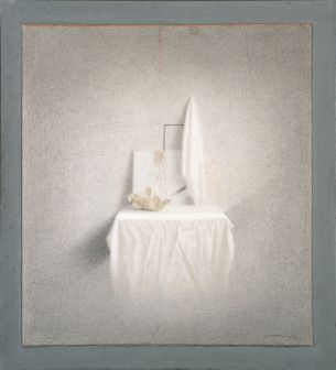 Oggetto e straccio rosa su quadrato, 1998, tecnica mista su carta applicata su tavola, 24, 7 x 31, 7