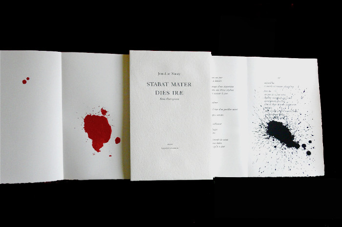 Questa edizione, composta a mano è stata stampata al torchio tipografico a braccia Stanhope in 60 esemplari e contiene due testi inediti di Jean-Luc Nancy e 6 tavole originali firmate da Claudio Parmiggiani.