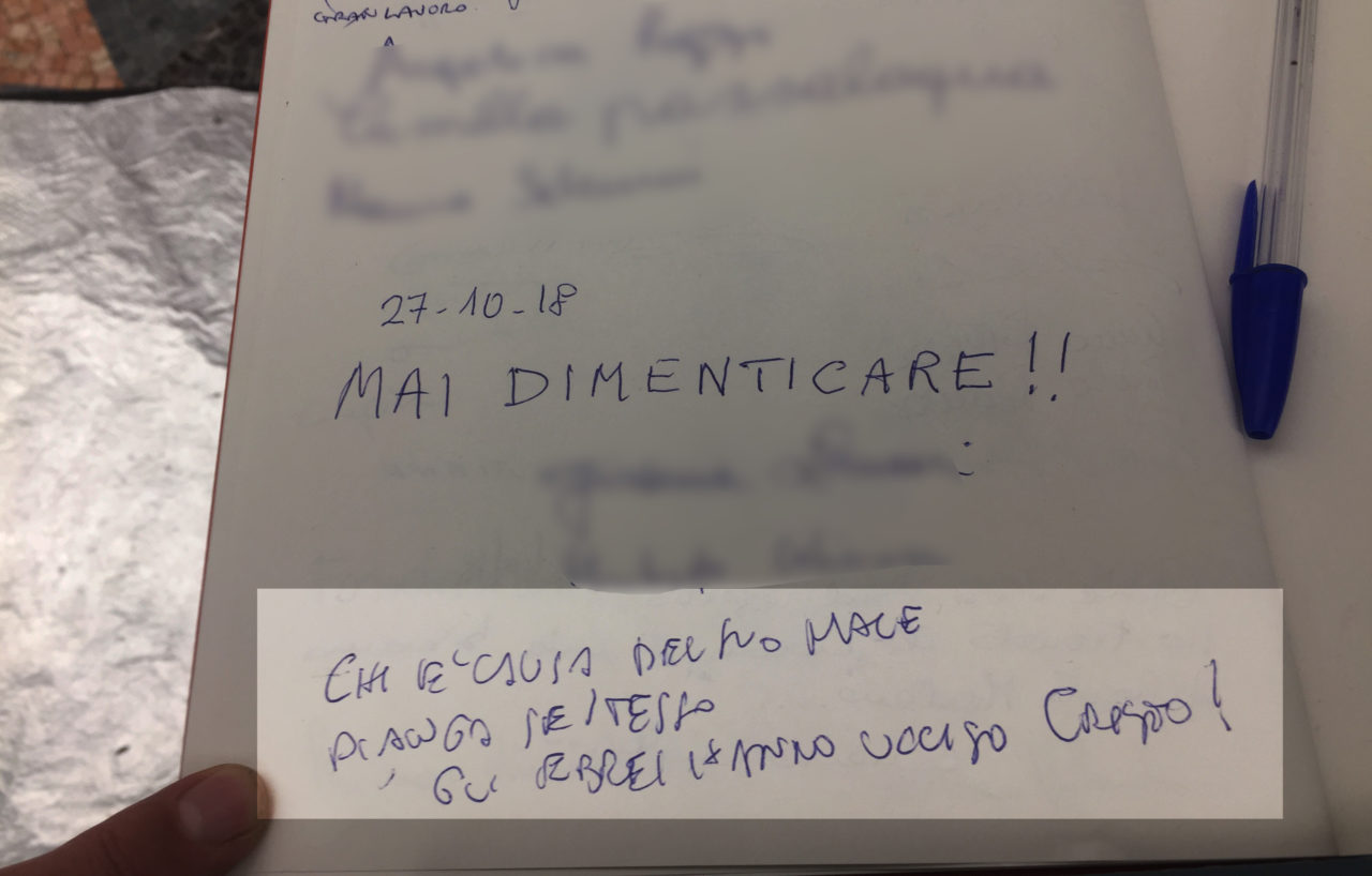 Lo lasciamo vedere nella foto che abbiamo scattato, senza trascrivere la frase, che non ci sentiamo di sporcare con quelle lettere e parole, il nostro sito.