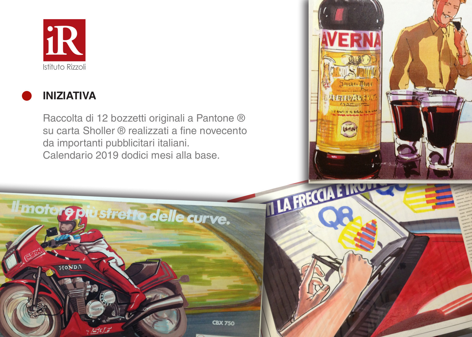La “Cartella del pubblicitario” calendario per il 2019 che Fondazione Istituto Rizzoli sta realizzando è, oltre che molto interessante, unica nel suo genere. Si tratta infatti di un calendario con 12 bozzetti, storici, disegnati a mano da importanti agenzie pubblicitarie di Milano.