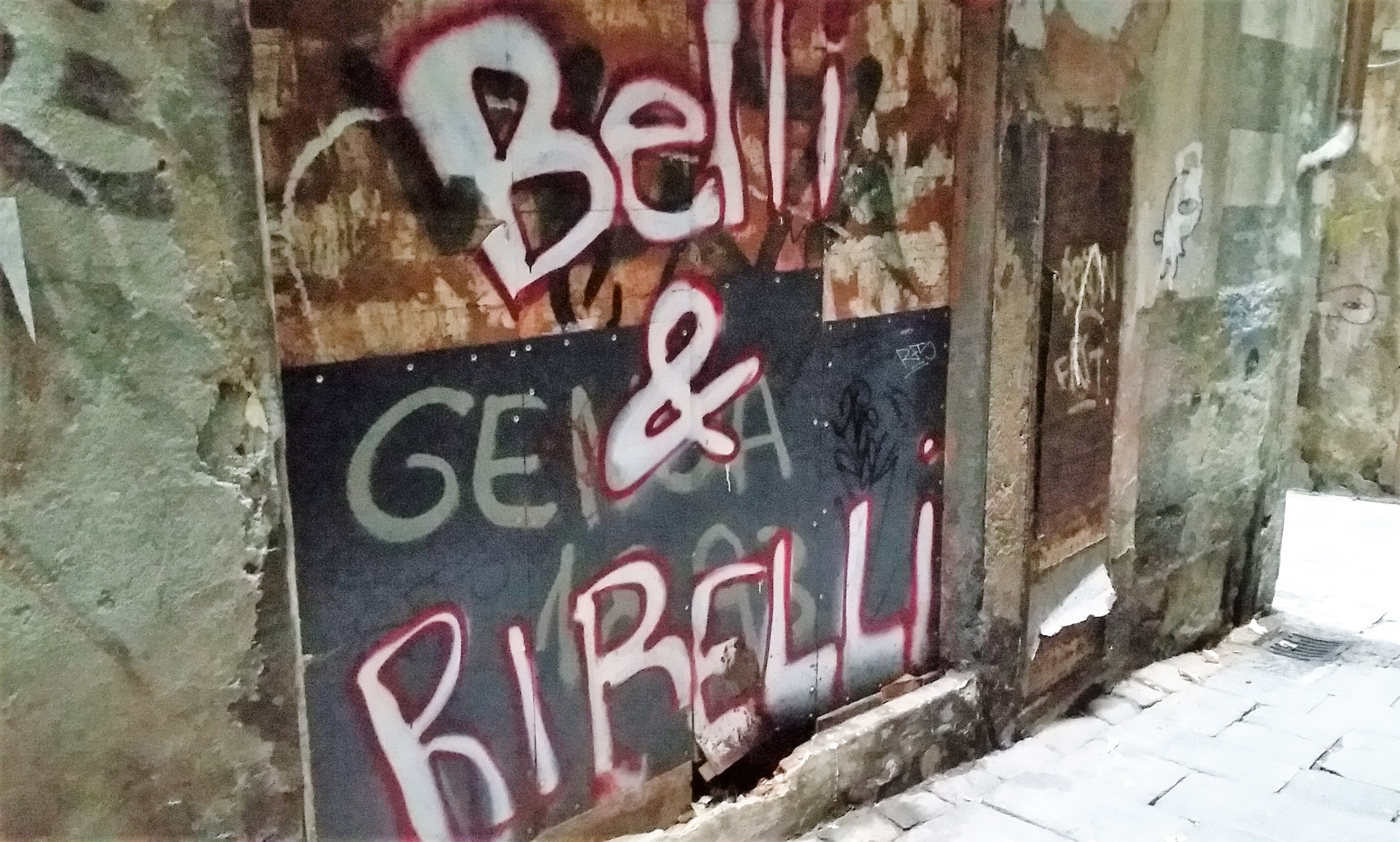 Ne abbiamo ‘raccolti’ un gran numero negli anni nel centro storico di Genova, che più di altri ben si presta a questo tipo di comunicazione, ma evitando le melliflue e banali scritte degli innamorati (con la sola simpatica eccezione in figura) o quelle becere dei tifosi, anche se alcune, specialmente nella dicotomia calcistica genovese, sono spiritose (almeno, quelle della parte storica).