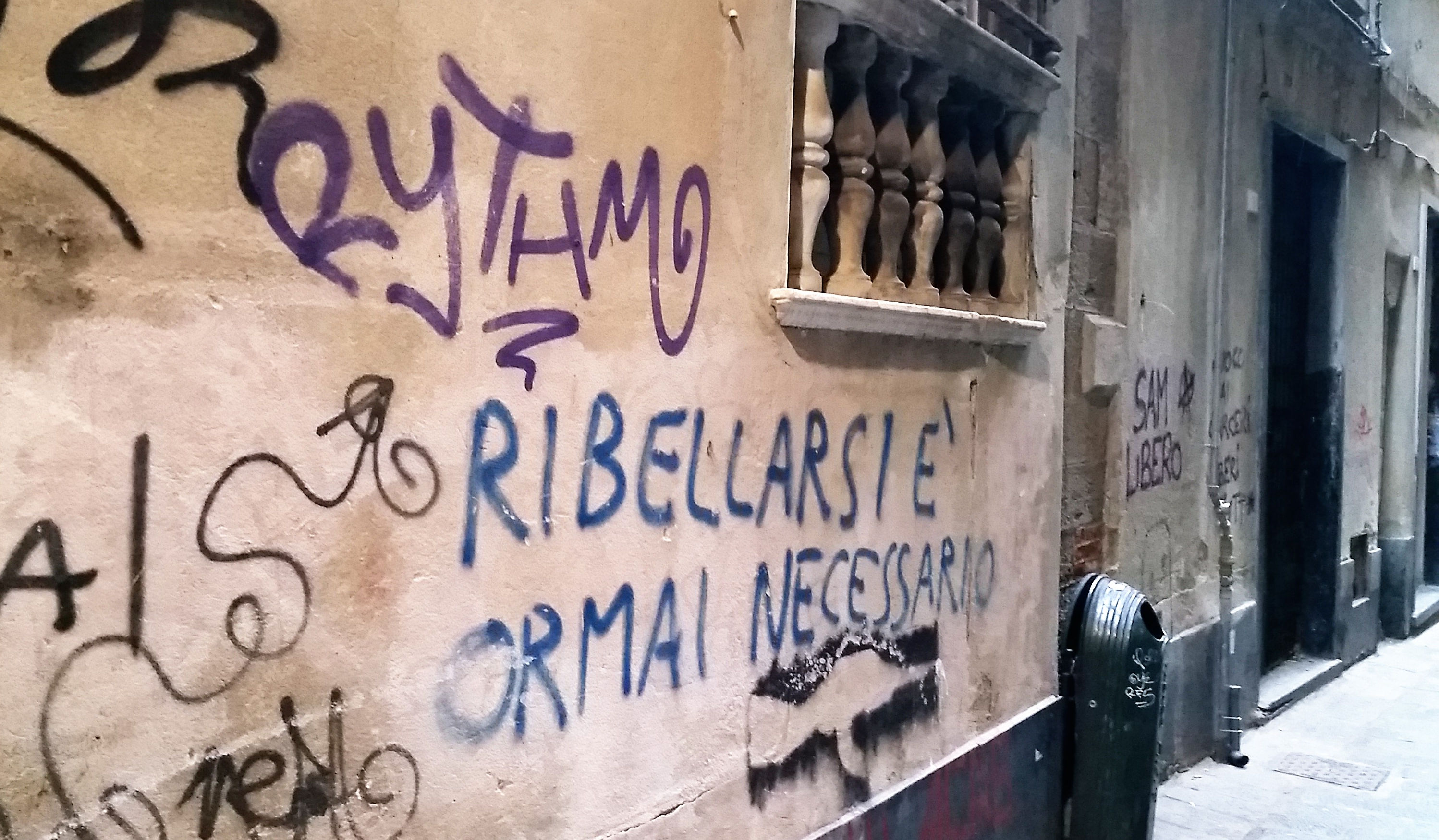 Numerose, ovviamente, le scritte anarchiche, che ben si immedesimano nell’ambiente dei carruggi, e che invitano a mettere la città a ferro e fuoco.