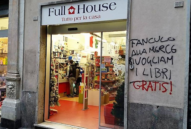 E poi, come vediamo dalle immagini e da altri messaggi (i soli riportati per ragioni di spazio, ma l’intera raccolta è a disposizione di chi fosse interessato), a volte la protesta ha un senso culturale come questa di “vogliamo i libri (gratis)” accanto all’ingresso di quella che era una libreria, chiusa e trasformata in vendita di alimenti etnici. Come la contestazione a un negozio bio che ha rimpiazzato una tradizionale drogheria; “e lo champagne? Lo ruberemo”. Del resto in uno dei vicoli più reconditi (e malfamati) c’è anche un “non lavorare, ruba”.
