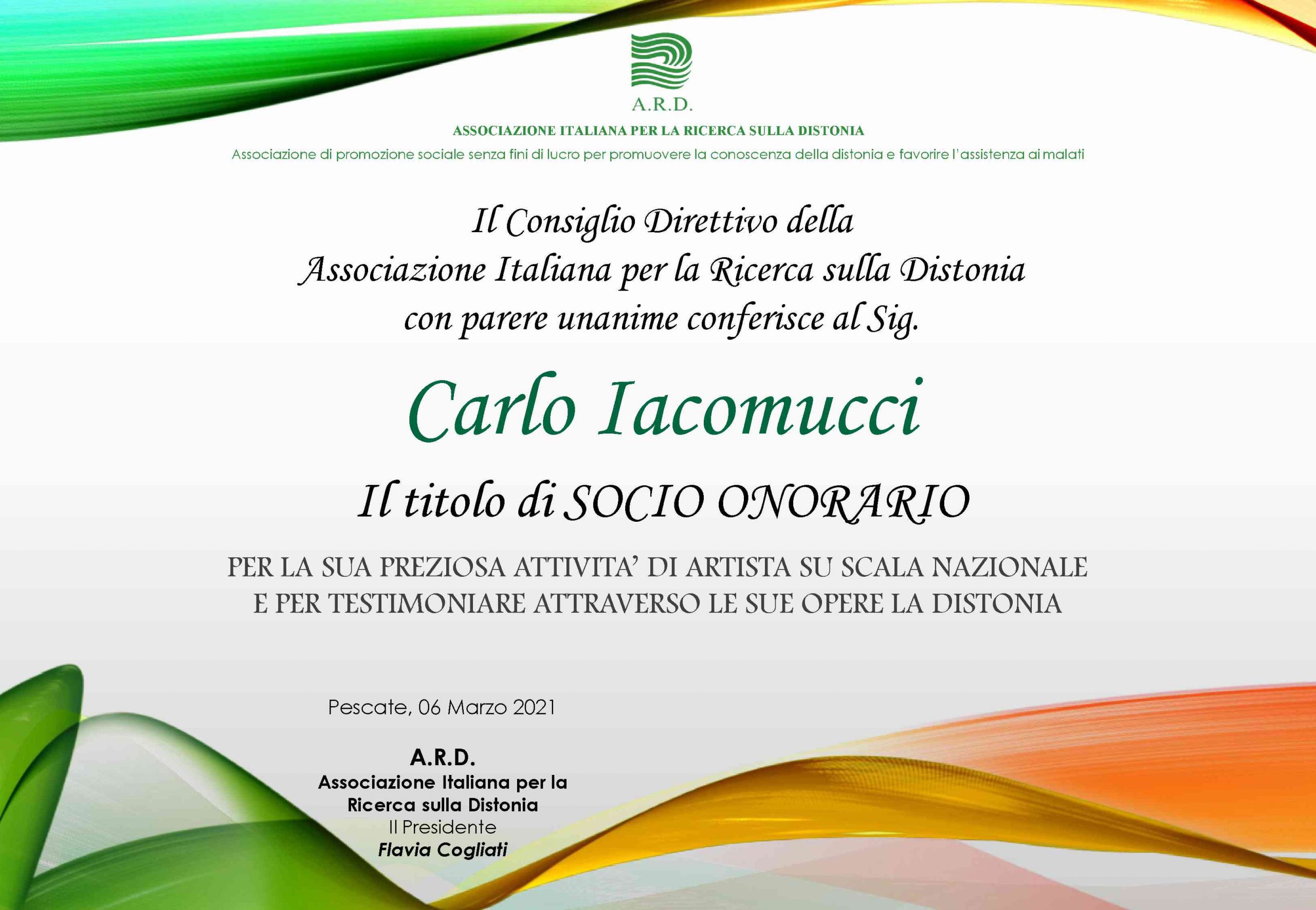 L’Associazione Italiana per la Ricerca sulla Distonia (A.R.D) ha così conferito a Carlo Iacomucci il titolo di “Socio onorario” per la sua opera di diffusione e di conoscenza della distonia e dell’associazione.