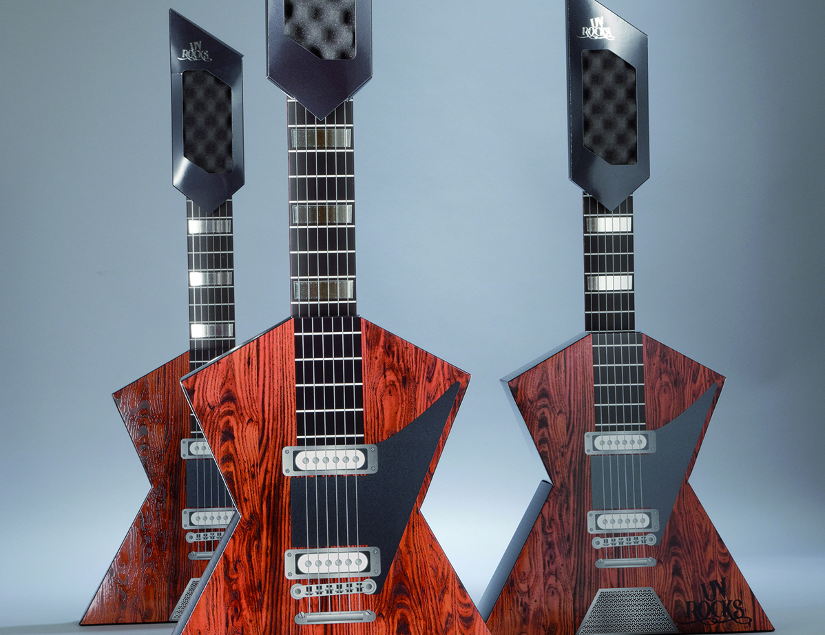 The paper guitar was specially UV-printed and refined by IST Metz and was distributed as a print gimmick by IST Metz during an in-house exhibition. In keeping with the event motto “UV rocks!“, the cardboard guitar was printed and finished live on IST Metz’s own sheet-fed offset printing machine. It consists of two parts, the neck and the body, which are folded into a three-dimensional body. For the curing of the inks, particularly energy-efficient UV systems from IST Metz were used as intermediate dryers and as final dryers. The paper guitar owes its high-quality print image and filigree varnish effects to these systems.
