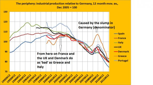 Significativo il grafico della produzione industriale negli ultimi anni che vede la sola Germania impennarsi, mentre Italia e Spagna restano agli ultimi posti (il diagramma a destra è tratto dall’articolo “La Produzione Industriale in Europa dal 1992 al 2011 – l’euro ha permesso un trasferimento colossale di produzione (e benessere) dall’Europa periferica alla Germania” del giugno 2012 e non riporta il secondo minimo segnato in quell’anno).