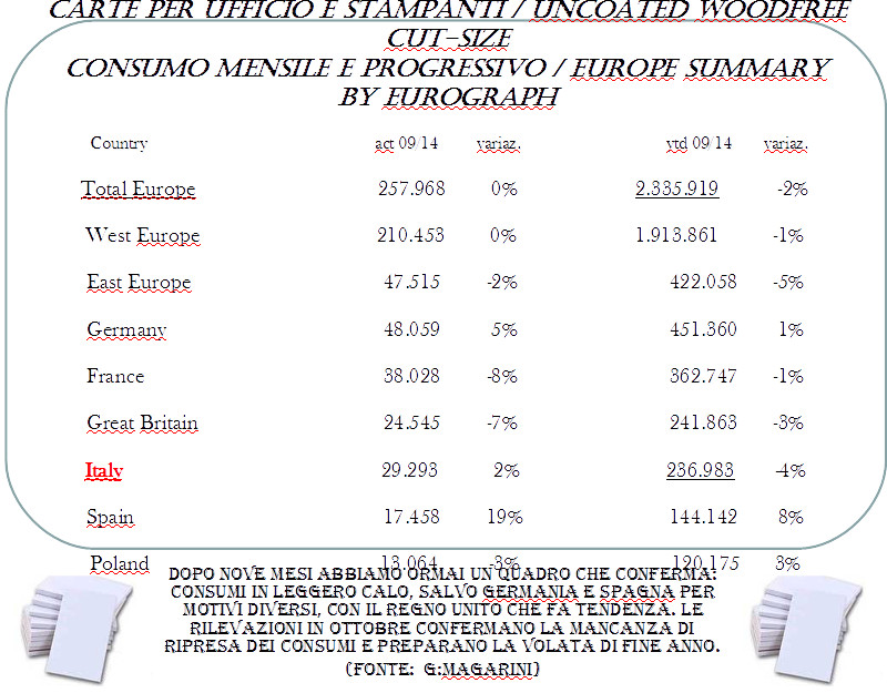 E’ un dato particolarmente interessante perché, dato il loro impiego, costituisce un indice indiretto sul volume di affari. Per ora il preconizzato ufficio senza carta, in realtà si sta rivelando un ufficio senza carta “stampata”. Di carta bianca, le “rismette” come vengono chiamate, i computer ne macinano in dosi da cavallo. Dopo nove mesi abbiamo ormai un quadro che conferma consumi in leggero calo. Si salvano Germania e Spagna per motivi diversi e il Regno Unito che fa tendenza. Le rilevazioni in ottobre confermano la mancanza di ripresa dei consumi e preparano la volata di fine anno. Così ci spiega l’Esperto Camerale Gianluigi Magarini.