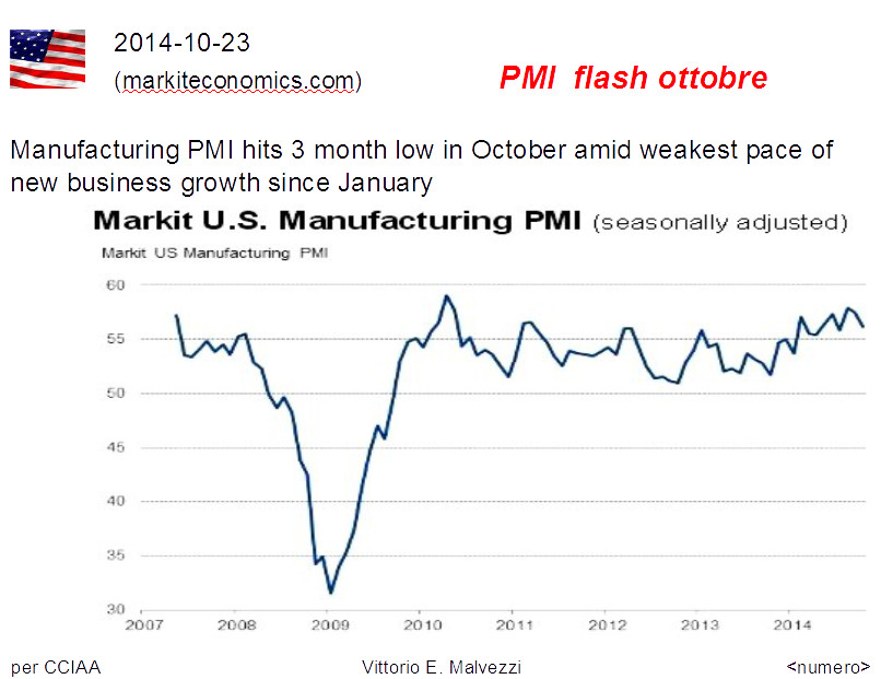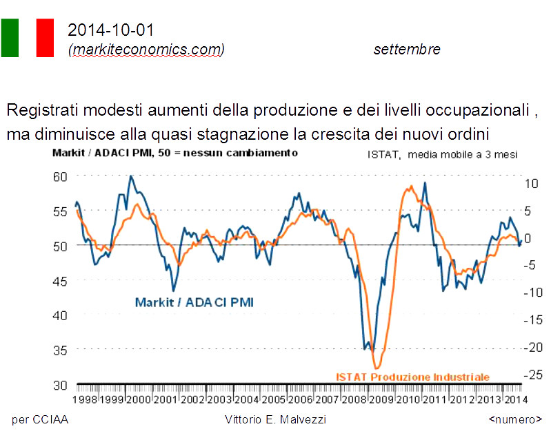Quindi una riunione di CCIAA che avviene di solito l’ultimo mercoledì del mese, necessariamente può disporre solo del PMI italico di inizio mese e relativo ai dati del mese precedente. L’unica considerazione positiva che si possa fare guardando il grafico, è che la caduta dell’Indice sembra essersi fermata proprio sulla linea di spartizione tra la situazione favorevole e il ristagno.