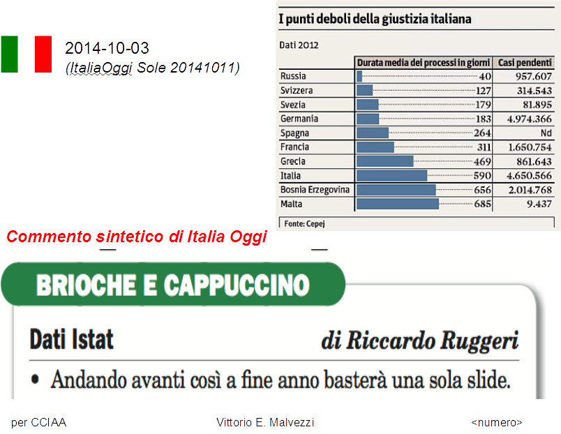 Giustizia – si fa per dire, neh ! uno dei punti negativi che penalizzano il patrio suol e ne abbattono drammaticamente l’attrattiva nei confronti degli investitori esteri, è proprio il modo come viene amministrata la giustizia in Italia. Un parziale indicatore è dato dal numero di giorni di durata di un procedimento giudiziario.