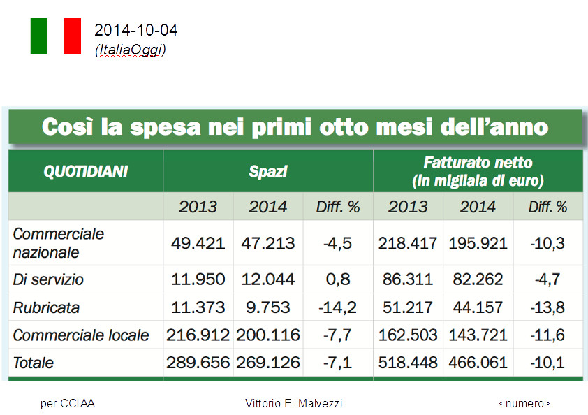 Raccolta Pubblicitaria Giornali – come sappiamo ben poco della macchina che sforna un giornale, viene pagato da abbonamenti e acquirenti. La pubblicità è il vero pilastro, quindi importanza vitale è tenere sotto controllo il suo andamento. Ad agosto il progressivo dice -10%. Se proprio vuoi cercare lati positivi, consolati pensando che nei mesi precedenti il dato era anche peggiore.