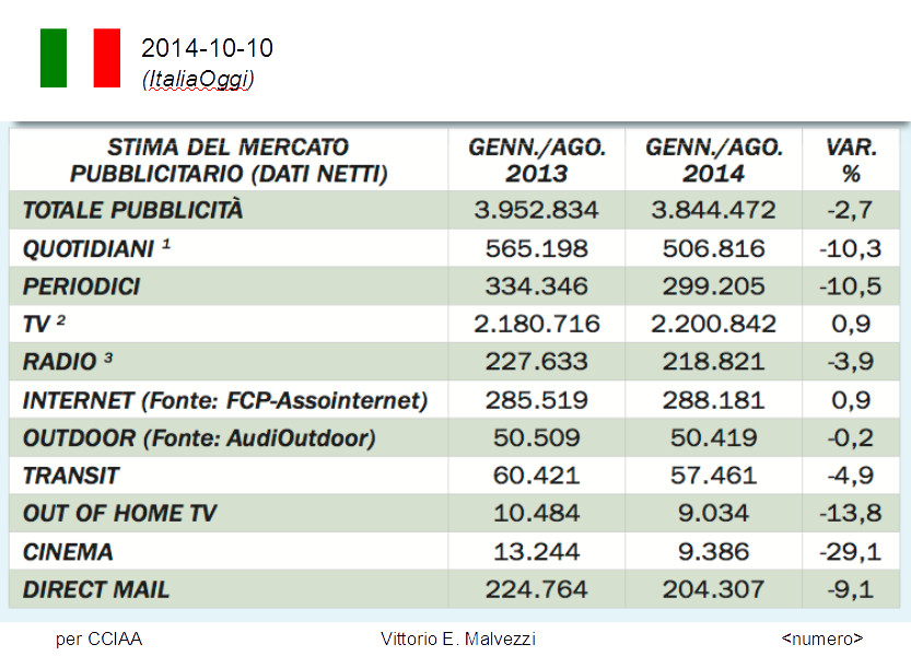 Mercato Pubblicitario – Tutto negativo. Gli unici che tendenzialmente reggono sono i dati riferentesi ai new media, ma come puoi vedere raffrontando i volumi, hanno ancora scarso peso in relazione alla globalità degli investimenti.