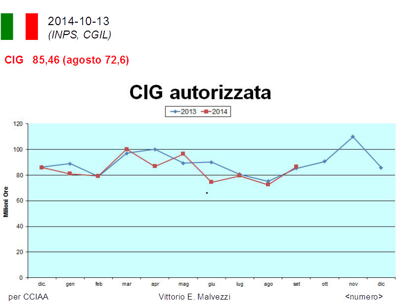 Cassa Integrazione – La CIG sale a 85,45 milioni di ore in settembre da 72,6 in agosto. Il dato in sé ha un valore indubbio, non è mai piacevole che aumentino le ore di CIG che costituirebbero una disoccupazione latente, se volessimo confrontarci con analoghe statistiche di altri stati. Però ricaviamo più informazioni se consideriamo un trend annuo e lo raffrontiamo all’andamento nell’anno precedente.