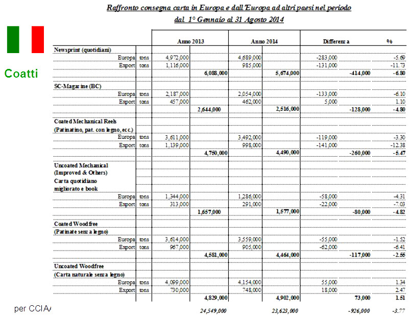 Andamento Consumi Carta – è una tabella che espone un raffronto della consegna di carta in Europa ed altri paesi, nel periodo dal 01/01/2014 al 31/08. Come avevamo già anticipato, di carta se ne consuma sempre meno. I dati aggregati ottenuti con un totale di totali vede a fronte di consegne nei primi 8 mesi del 2013 per 24,5 milioni di tons, una consegna nei primi 8 mesi del 2014 di 23,6 milioni di tons con una perdita secca di quasi un milione di tons., quasi un 4%. (v. grafico qui sotto a sinistra).