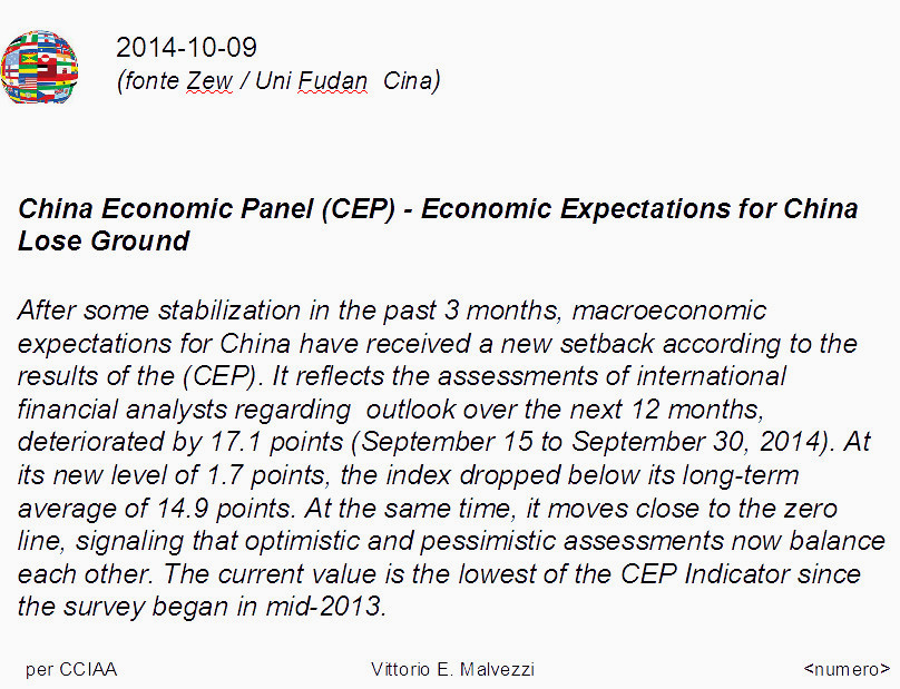 Zew più Uni di Fudan rilasciano mensilmente un indice, il CEP, che rappresenta l’andamento economico del paese. L’affidabilità del nome internazionalmente noto dei tedeschi, con le risorse locali qualificate, portano a risultati che vanno tenuti d’occhio. Nella fattispecie il titolo è già emblematico. Le aspettative economiche della Cina perdono terreno.