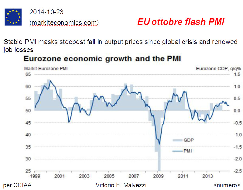 Eurozona, Indice PMI messo a confronto con la crescita economica misurata dal Pil. Un PMI che è stabile, maschera però una profonda caduta nei prezzi di produzione