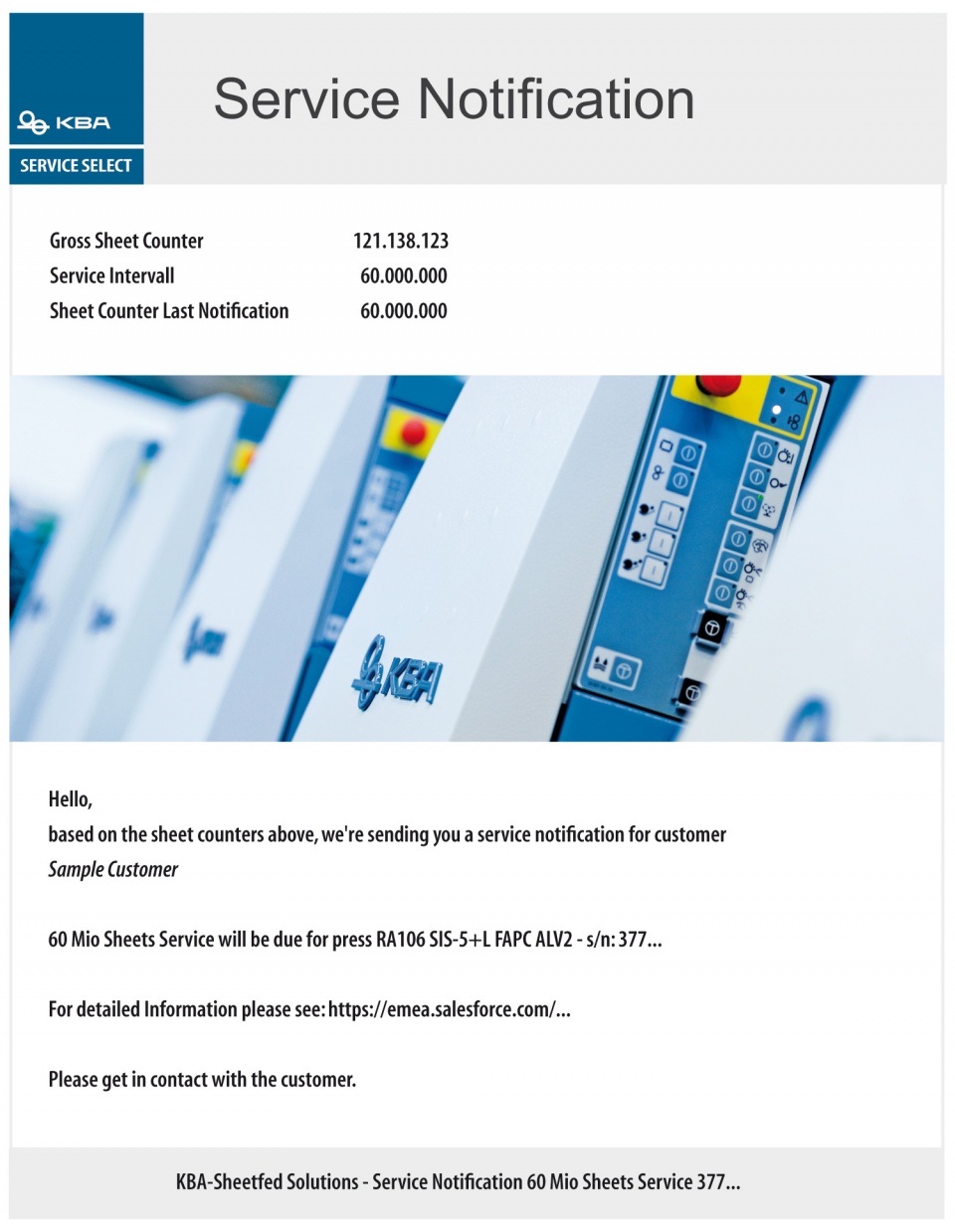 L’interconnessione dei clienti e delle rispettive macchine con KBA e i dati disponibili sulle prestazioni consentono a KBA di mostrare ai clienti i potenziali di ottimizzazione sulla base dei dati rilevati e, di conseguenza, come realizzarli. Tappe importanti, come il superamento di un determinato numero di fogli, vengono riconosciute tempestivamente e trasmesse automaticamente tramite e-mail sotto forma di avvertenza di manutenzione.