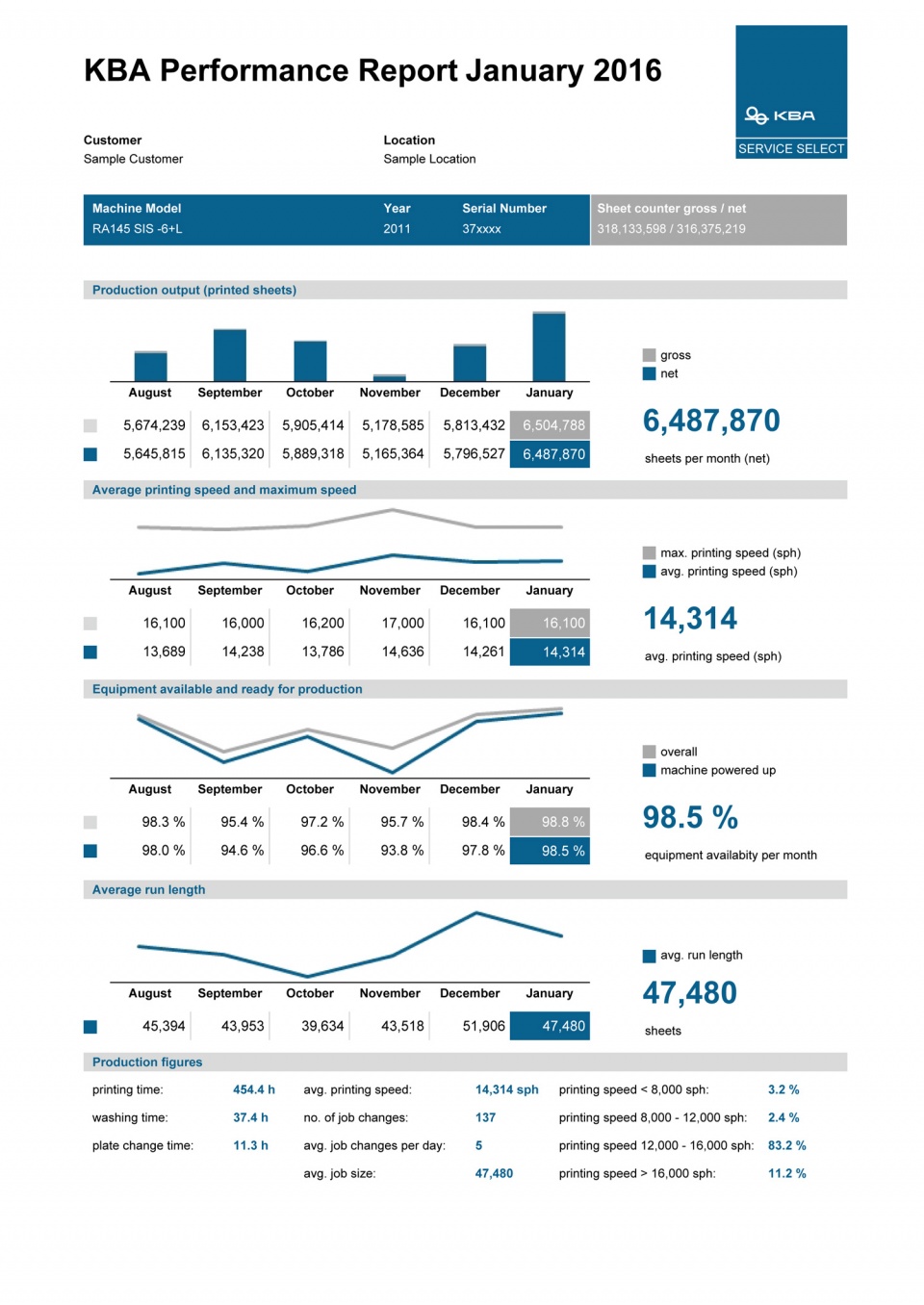 Questi report di performance sono elementi opzionali dei contratti di manutenzione remota, ma possono essere richiesti anche separatamente. In rappresentazioni grafiche di facile lettura, i report forniscono anche informazioni sul rendimento delle macchine, sulla velocità di produzione massima e media, sull’operatività di produzione, sui quantitativi d’ordine e sui tempi di stampa, lavaggio e cambi lavoro.