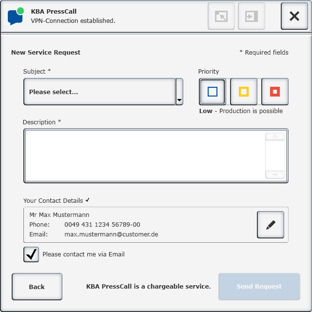 PressCall: così si chiama la nuova comunicazione di guasto automatica della macchina che va a sostituire la consueta chiamata dell’utilizzatore alla linea telefonica diretta KBA. Tutti i dati rilevanti di manutenzione remota vengono trasmessi all’assistenza senza ritardi e direttamente. Per gli utilizzatori e la manutenzione KBA, ciò presenta diversi vantaggi, come tempi di reazione più rapidi, ottimizzazione della comunicazione e della registrazione dei guasti, identificazione univoca della macchina, analisi tempestiva dei dati della macchina, reazione attiva e più rapida da parte di KBA, meno errori nei dati.