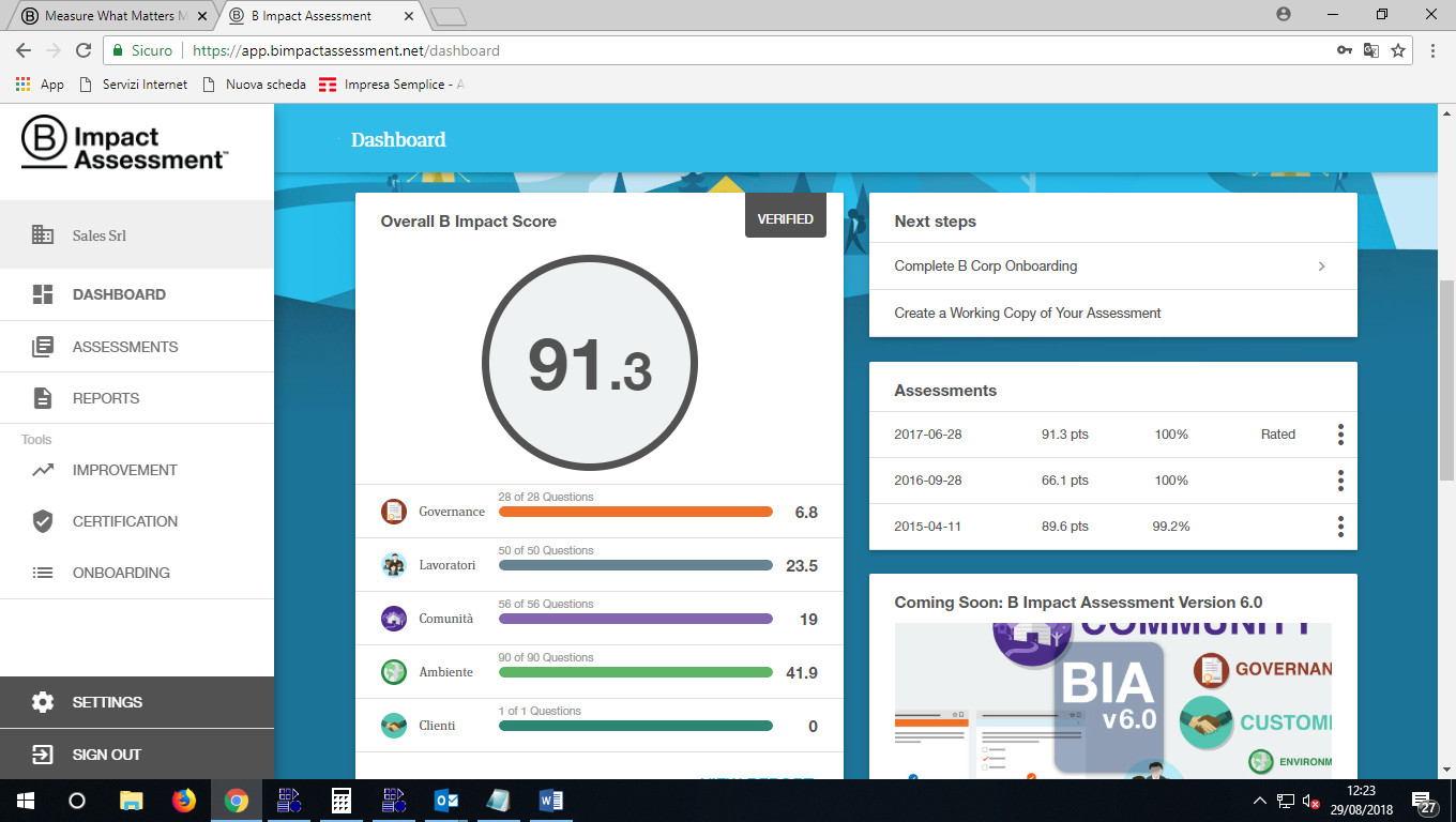 Per ottenere la certificazione l’azienda completa il questionario B Impact Assessment: uno strumento di analisi on-line, gratuito e confidenziale.