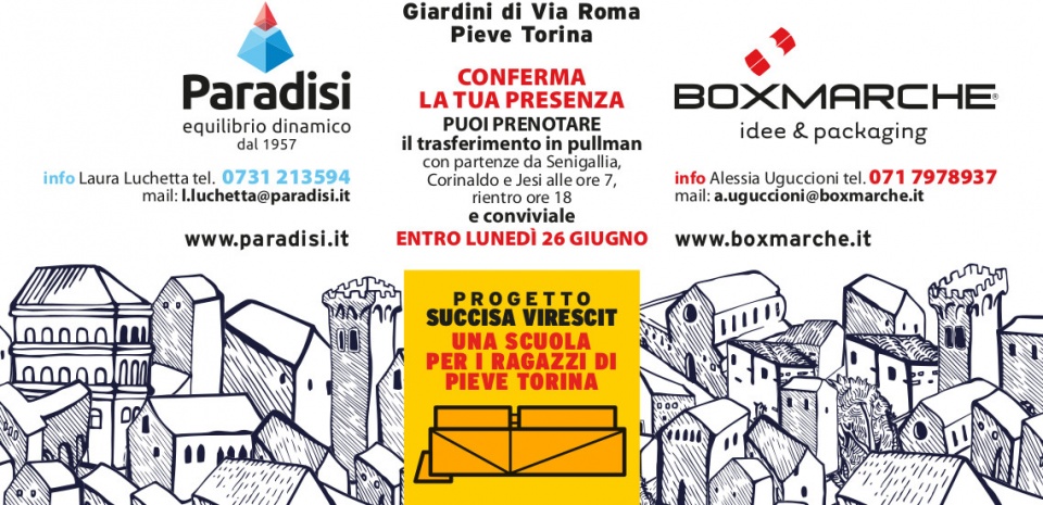 Connettere, interagire, costruire. Una rete virtuosa per il futuro è il convegno annuale di BoxMarche che quest’anno è stato organizzato sabato 8 luglio a Pieve Torina dove l’azienda cartotecnica di Corinaldo ha avviato il Progetto Succisa Virescit per la ricostruzione, dopo il terremoto, di “Una Scuola per i ragazzi di Pieve Torina”. Informazioni e prenotazioni a Alessia Uguccioni tel. 071 7978937 mail: a.uguccioni@boxmarche.it