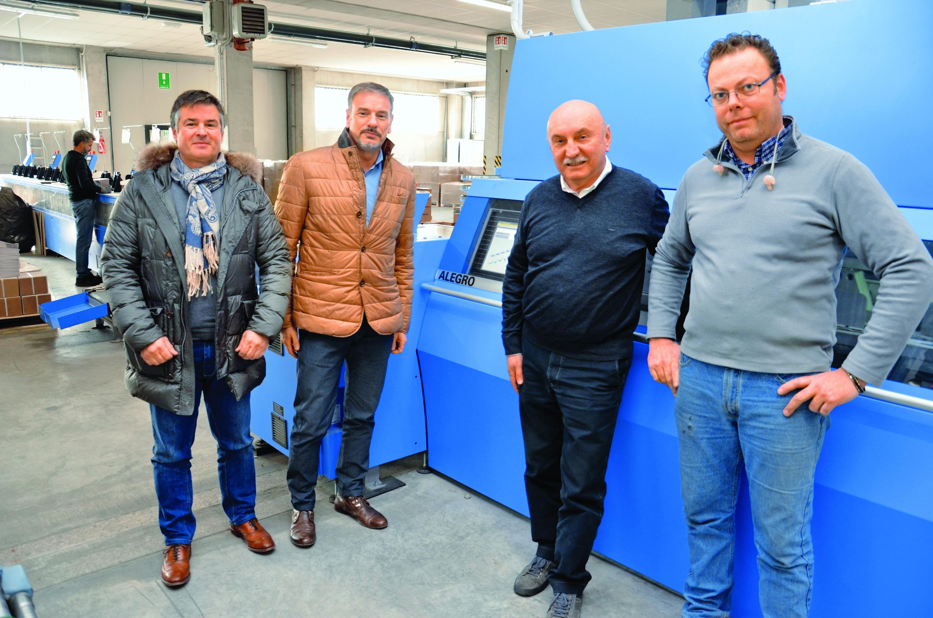 Da destra: l’operatore macchina Giorgio Marcato, il proprietario dell’azienda Ivano Bastianello, Francesco Bertuzzo e Fabio Casale (entrambi di Müller Martini Italia) davanti alla brossuratrice Alegro presso Nuova Jolly