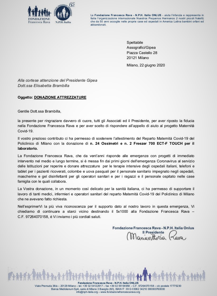 Grazie alla decisione di GIPEA di donare 25.000 euro, è stato possibile contribuire all’acquisto di attrezzature necessarie all’allestimento del Reparto Maternità Covid-19 del Policlinico Mangiagalli di Milano. Il progetto che GIPEA ha scelto di sostenere è volto a creare percorsi separati e sicuri di nascita per le mamme positive e i loro neonati. In particolare, grazie al contributo GIPEA sono stati donati al reparto Maternità Covid-19 del Policlinico 24 ossimetri e 2 Freezer 700 ETC-F TOUCH per il laboratorio.