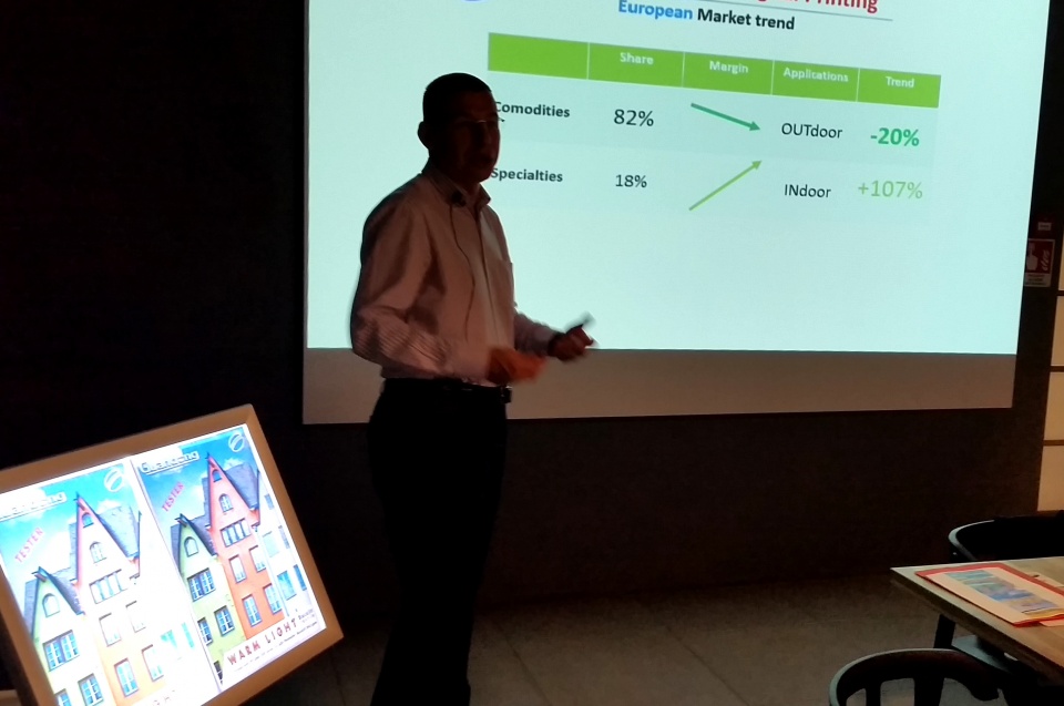 La filiera della comunicazione visiva comprende il produttore, il distributore, lo stampatore e il cliente finale. «In realtà il vero venditori del prodotto è lo stampatore, che deve stimolare il cliente con idee e proposte – afferma Elmi. – Il nostro cliente è la distribuzione organizzata, ma per stimolare la domanda sono anni che affrontiamo il mercato facendoci portavoce di un processo di culturizzazione a valle, soprattutto nei confronti degli stampatori che per noi rappresentano i veri decision maker. È infatti lo stampatore che trasforma in realtà le idee creative dei committenti e delle agenzie, che spesso devono essere tradotte per trovare concretezza. Per questo alimentiamo il costante dialogo con gli stampatori, che guideranno poi i clienti nella scelta del supporto più appropriato per raggiungere il risultato desiderato.»