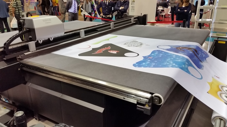 Quello che subito colpisce dello stand B+B International – tappa d’obbligo per ogni visitatore – è l’imponente plotter da taglio, cordonatura e fresa Kongsberg che, messo in funzione, attira subito i visitatori che si fermano ad ammirare la precisione di taglio, la velocità e anche il suo tocco estetico, magari in attesa di portare via qualche simpatico campione.