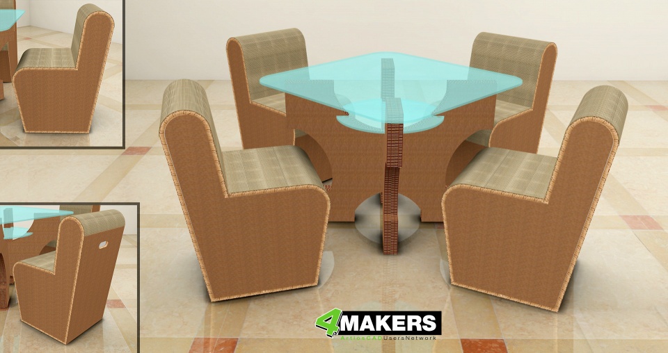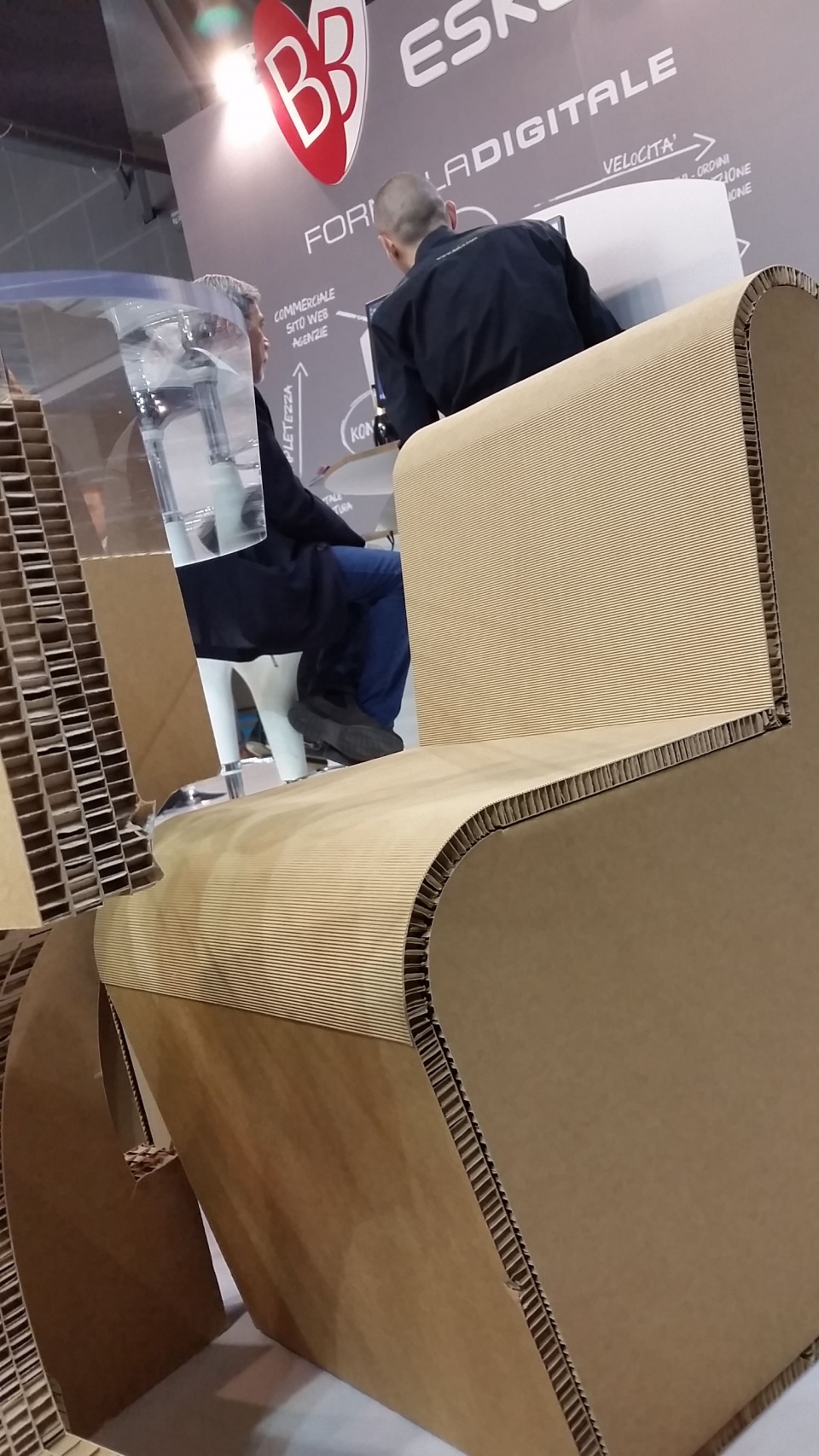 Quello che invece i visitatori frettolosi non possono notare è ciò che sta dietro le quinte e che può essere realizzato con questo plotter e i software adeguati. Oltre agli espositori, le sedie e i tavoli esposti in fiera – quest’anno con una novità per l’utilizzo di un materiale povero ma con soluzioni che ne fanno un prodotto unico nel suo genere, come le poltroncine dello stand illustrate nelle immagini qui sotto a sinistra –, B+B mette a disposizione una ricca libreria di progetti parametrici di espositori e complementi d’arredo in cartone ondulato che i ‘ragazzi’ di B+B inventano e realizzano ogni settimana per renderli disponibili a tutte le aziende clienti e liberi professionisti che possono utilizzarli per le proprie realizzazioni.  È, questa, l’idea 4MAKERS.