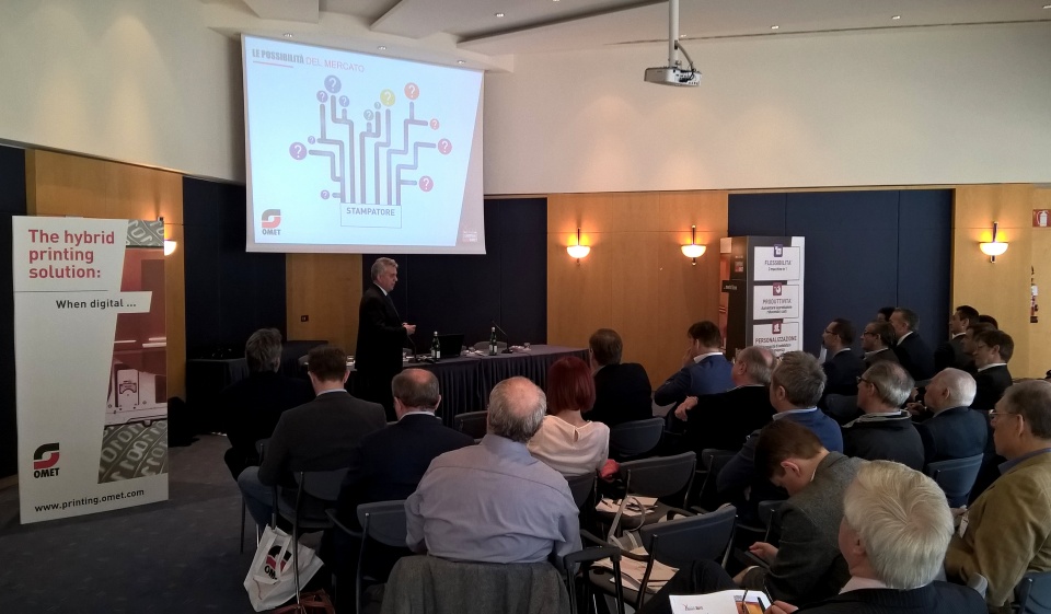 WP_20160414_10_26_38_ProDopo una presentazione dell’evoluzione del mercato della stampa, con dati che hanno evidenziato la continua crescita del settore delle etichette per i prossimi 5 anni, da cui emerge il crescente interesse per la tecnologia ibrida, Marco Calcagni (Omet sales manager) e Arnold Van Oudheusden (Domino Digital) hanno presentato le potenzialità e le opportunità della tecnologia di stampa ibrida flexo+digitale della XFlex X6 JetPlus e i relativi vantaggi economici che l’utilizzo di una macchina ibrida può portare ad uno stampatore.