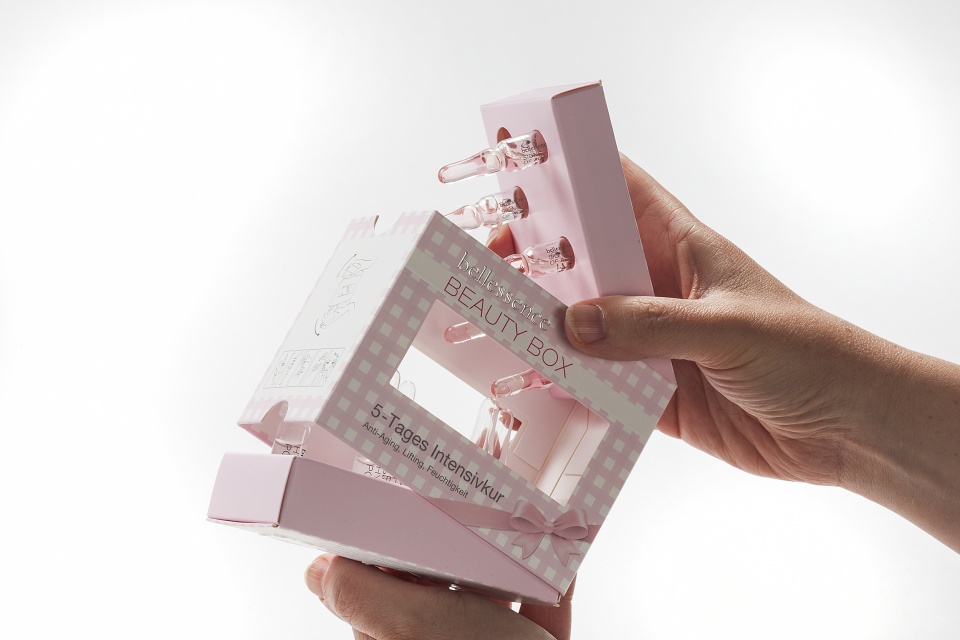 Il Beauty Box del marchio FEMIA Cosmetics Vertriebsgesellschaft GmbH è un trattamento intensivo della durata di cinque giorni che, grazie alla sua alta concentrazione di ingredienti, rappresenta un vero toccasana per la pelle. La confezione colpisce al primo sguardo sugli scaffali dei punti vendita: la finestrella nell’astuccio polarizza l’attenzione sulle dieci fragili fiale in vetro contenenti il liquido rosa per il trattamento cosmetico. Il Beauty Box è stato esposto nei negozi in occasione della Festa della Mamma come esclusivo tocco di bellezza.