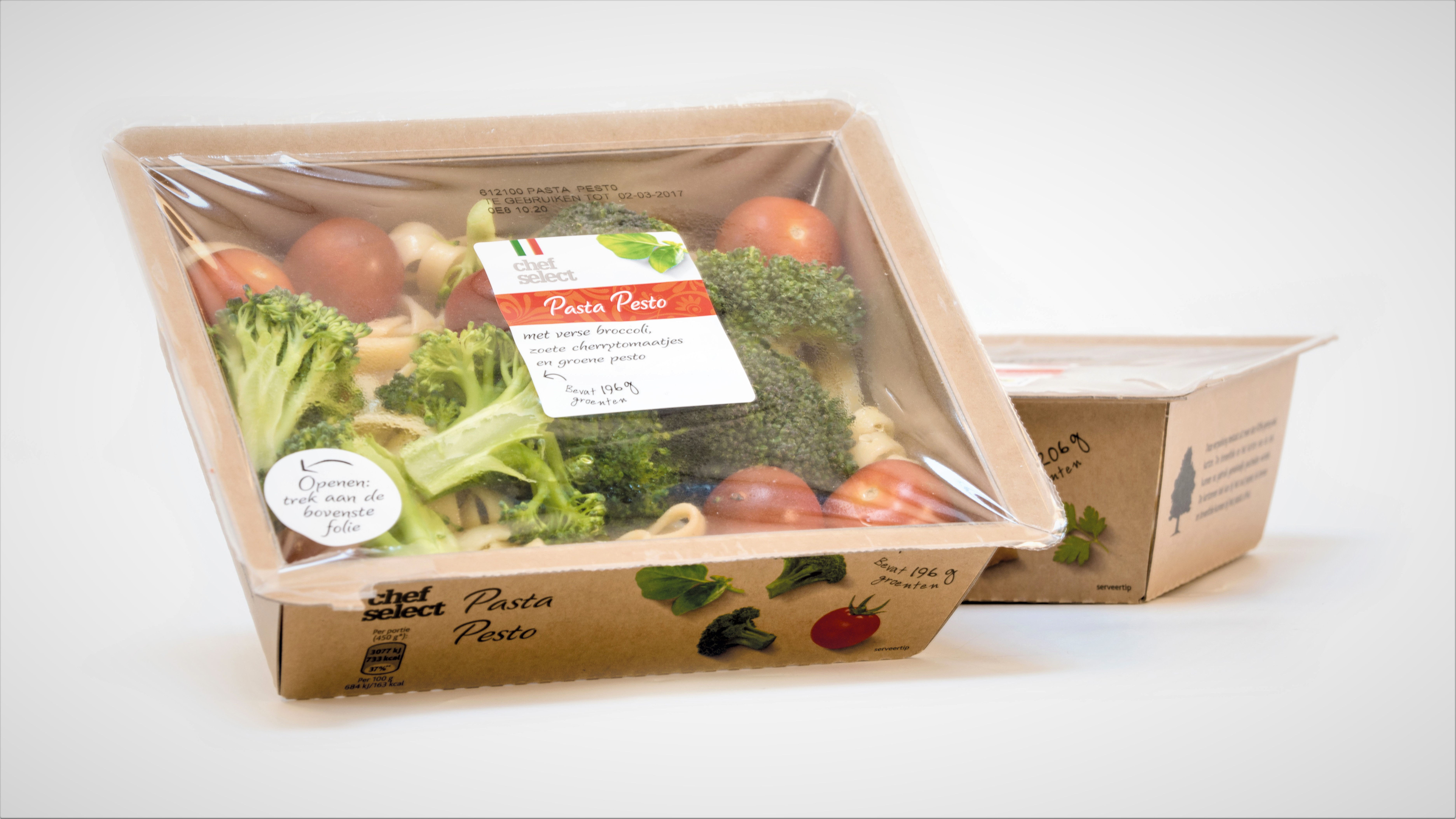 Personalizzabile o già disponibile in diversi formati per confezionamenti MAP e Skin, Halopack è un pack composto fino al 90% da cartoncino riciclato e da un sottile film plastico, applicato senza uso di colle, che permette la tenuta d’aria del vassoio.