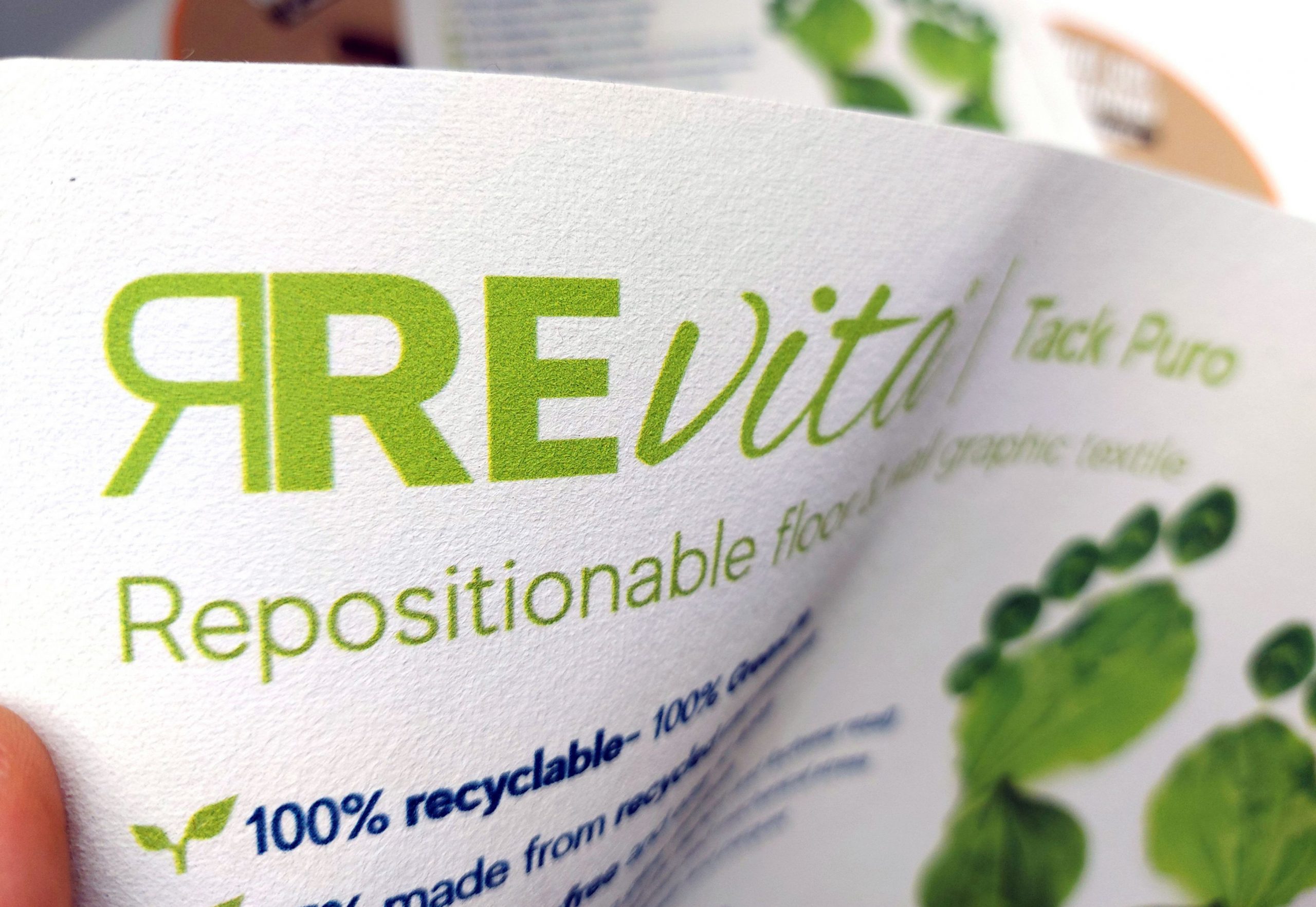 REvita Tack Puro è a oggi un supporto unico sul mercato, che nasce dall’unione di due tra le più recenti novità della gamma Guandong: REvita Puro, tessuto in poliestere ottenuto dal riciclo di bottiglie in PET, e Two Tack, biadesivo attacca-stacca universale con tecnologia Nano-Tack.