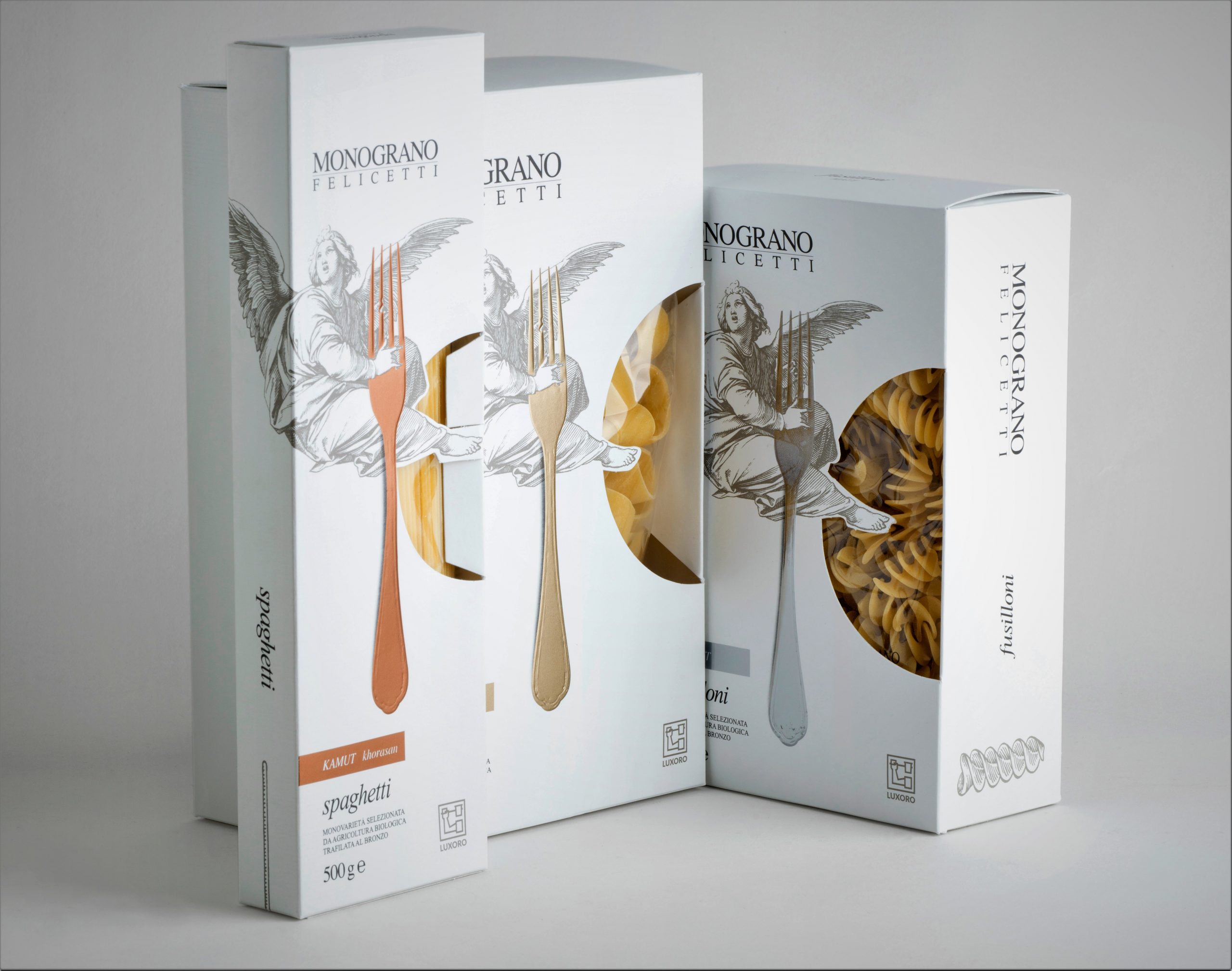 Dalla collaborazione tra un produttore di effetti metallizzati per la stampa a caldo, un pastificio artigianale e uno studio grafico è nata una particolare soluzione di packaging in grado di offrire il massimo risalto al contenuto. L’obiettivo del progetto di Luxoro, Felicetti e Aldo Segat Studio era chiaro: valorizzare sugli scaffali una pasta di particolare prestigio ottenuta da trafile in bronzo, vere e proprie sculture di oreficeria meccanica. Elevare quindi il prodotto senza snaturarne l’essenza. Queste erano del resto le premesse stesse da cui è nata la Limited Edition per Pasta Felicetti.