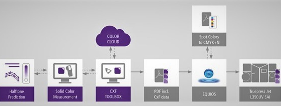 La recente Truepress Jet L350UV SAI sviluppata da Screen elabora i PDF con i dati CxF immagazzinati e li può separare in esacromia (CMYK + OB) per ottenere i colori brand con la stampa inkjet.