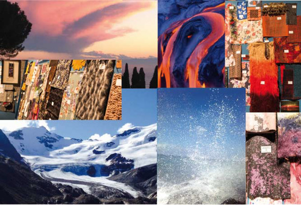 Sfumature opalescenti, cristalline, Laminature vetrose tipo lastra ghiacciata .Voile e organze con fili in lurex trasparente e iridato, uso di pellicole madreperlate su varie fondi, jersey stampato in mohair con “effetti ghiacciati”, applicazioni con pietre/cristalli e paillettes. Bottoni spessorati in madreperla e strass.