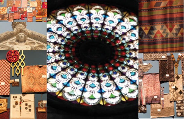 Jacquard, stampe, ricami da tappeti persiani/caucasici, Arabeschi laccati. Tonalità come pietre preziose, Lurex oro e rame per jacquard floreali.