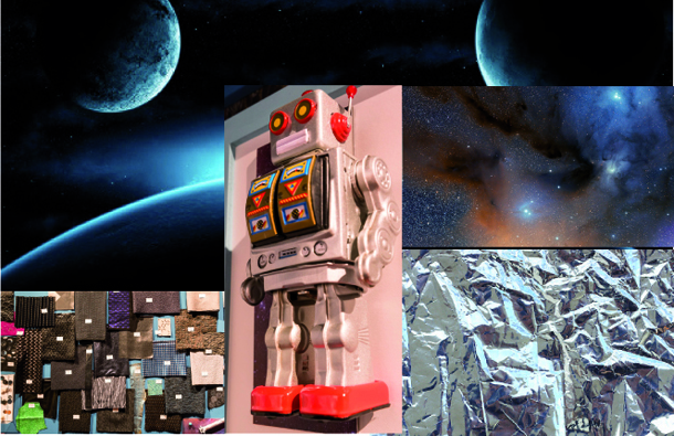 Lamine cromate, fogli di alluminio, Jersey compatti e lane peso cappotto con laminature cromate, lamé peltro/titanio goffrato a macro bolle. Tecno-jersey stampato e ricamato con borchie effetto cuspide.
